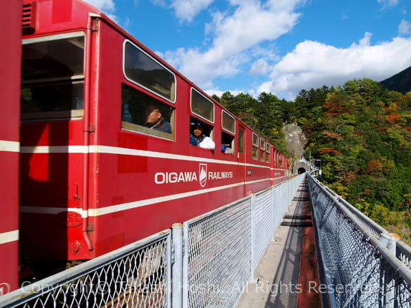 写真中央のトロッコ列車が止まっている半島の先端が奥大井湖上駅で、その両側に伸びる2つの赤い鉄橋が、お台場より先に命名された元祖レインボーブリッジだ。湖上約70mということで橋脚の高さが印象的だ。こちらの封鎖は簡単そう!?