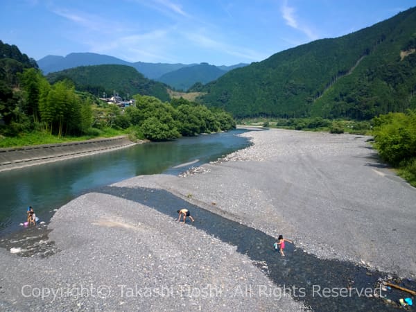 中河内川に架かる吊り橋の両サイドには、自然豊かな玉川地区の景観が広がっている。夏場は河原で元気に水遊びを楽しむ子供たちの姿が見られる。全国屈指の水質のキレイさを誇る安倍川水系なので、子供たちも安心だ。