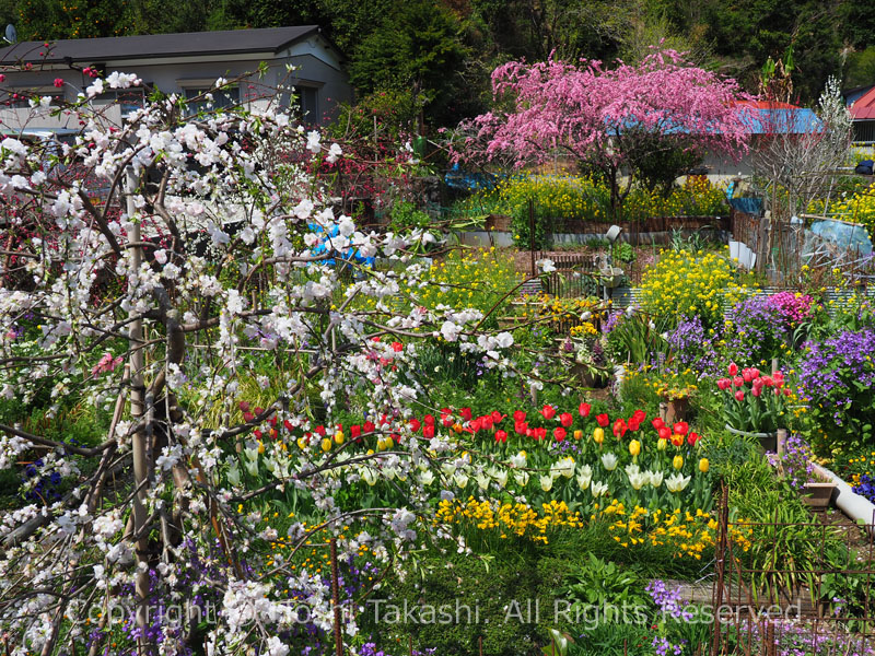 この庭に一歩足を踏み入れれば、まさに桃源郷という感じの別世界が広がっており、ボードウォークを歩きながら花を愛でたり、色彩豊かな庭全体を見渡したりしながら、白・桃・紅の花が鈴なりに咲く鈴木さんが作り上げた桃源郷に思いを馳せよう!