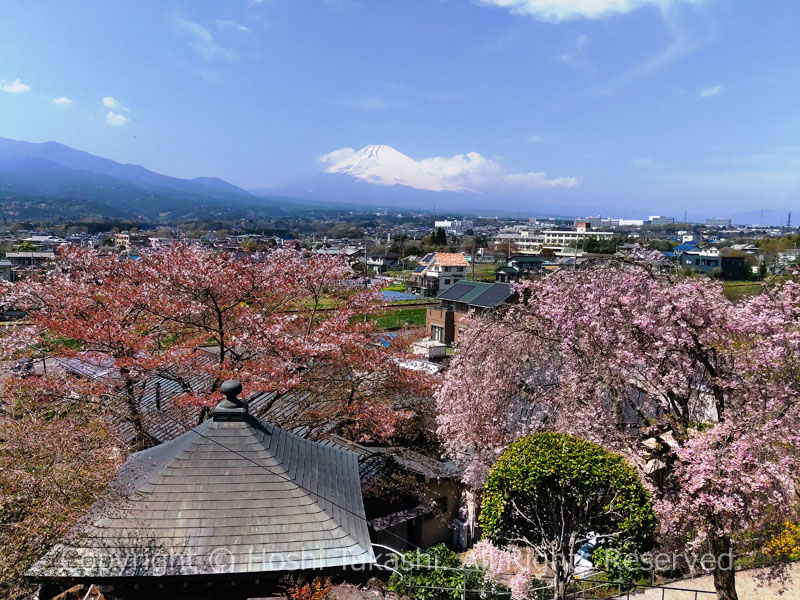 西安寺に咲く桜越しに見る富士山は最高だよ! 眼下に新東名や裾野市内の街並みも見渡せるよ!