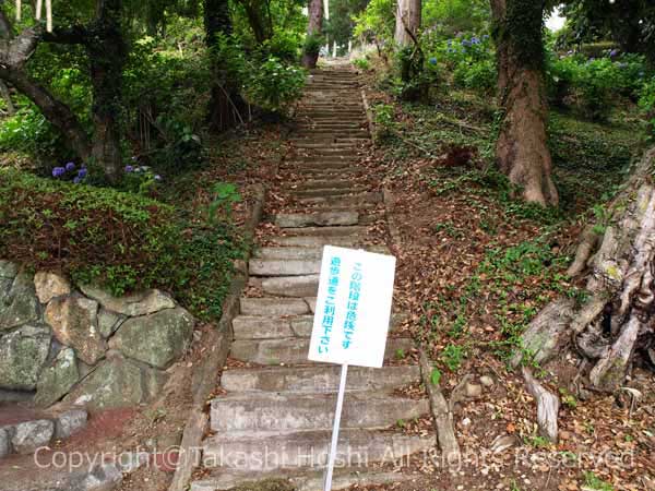 鳥居の先に伸びる参道の石段は、真っ直ぐで急な直階段で、荒れていることもあり、現在は通行を控えるよう促している。