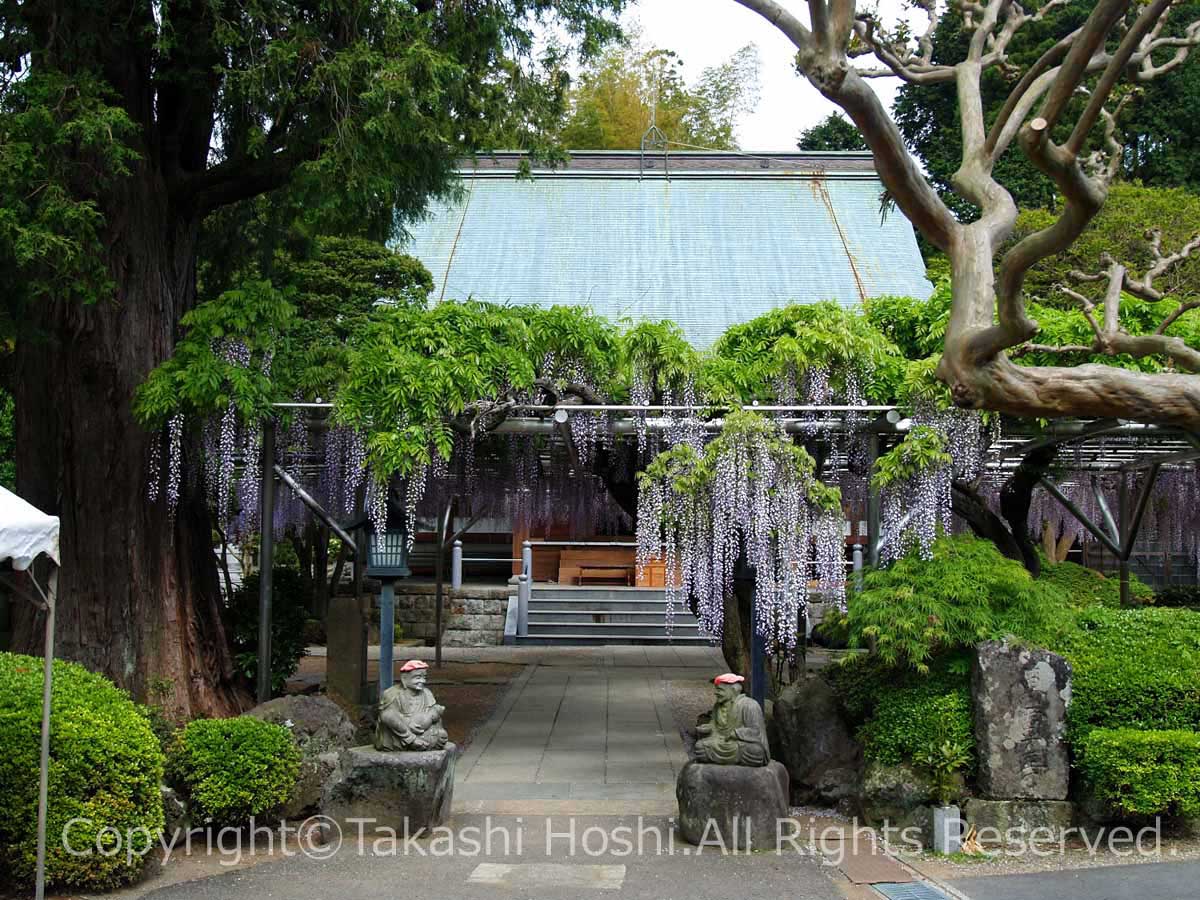 藤棚のフジの花が伸びてくると、入口から見る本堂の眺めが一変する。ただでさえ整い気品溢れる林泉寺境内だが、藤の花によりさらに上品なものへと高められ、寺の印象そのものがより高貴なものとなるから不思議だ。林泉寺のフジは、単に彩りを添えるレベルではない!