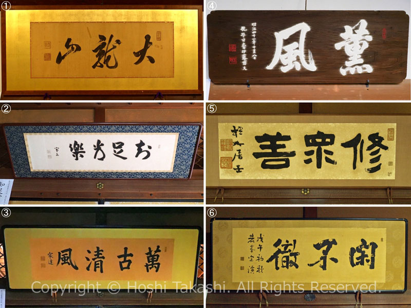 ①山門と同じ山号『大龍山』15代将軍 徳川慶喜 書 ②『知足常楽』宗家17代 徳川家正 書 ③『萬古清風』宗家16代 徳川家達 書 ④『薫風』伊藤博文 書 ⑤『修衆善』衆善を修むと読む ⑥『閑不徹』徹底した静けさのことで恭峯宗演 書